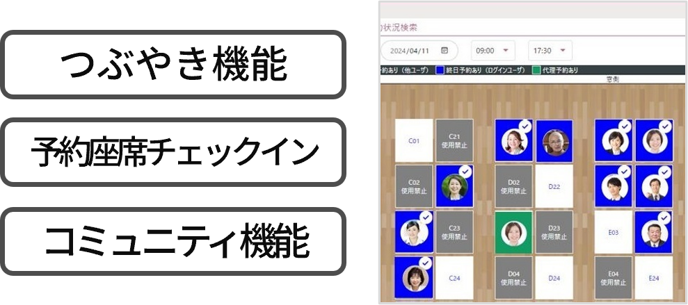 フロアマップには顔写真が表示され、誰がどこにいるか一目瞭然です。座席変更も簡単な操作で完了します。