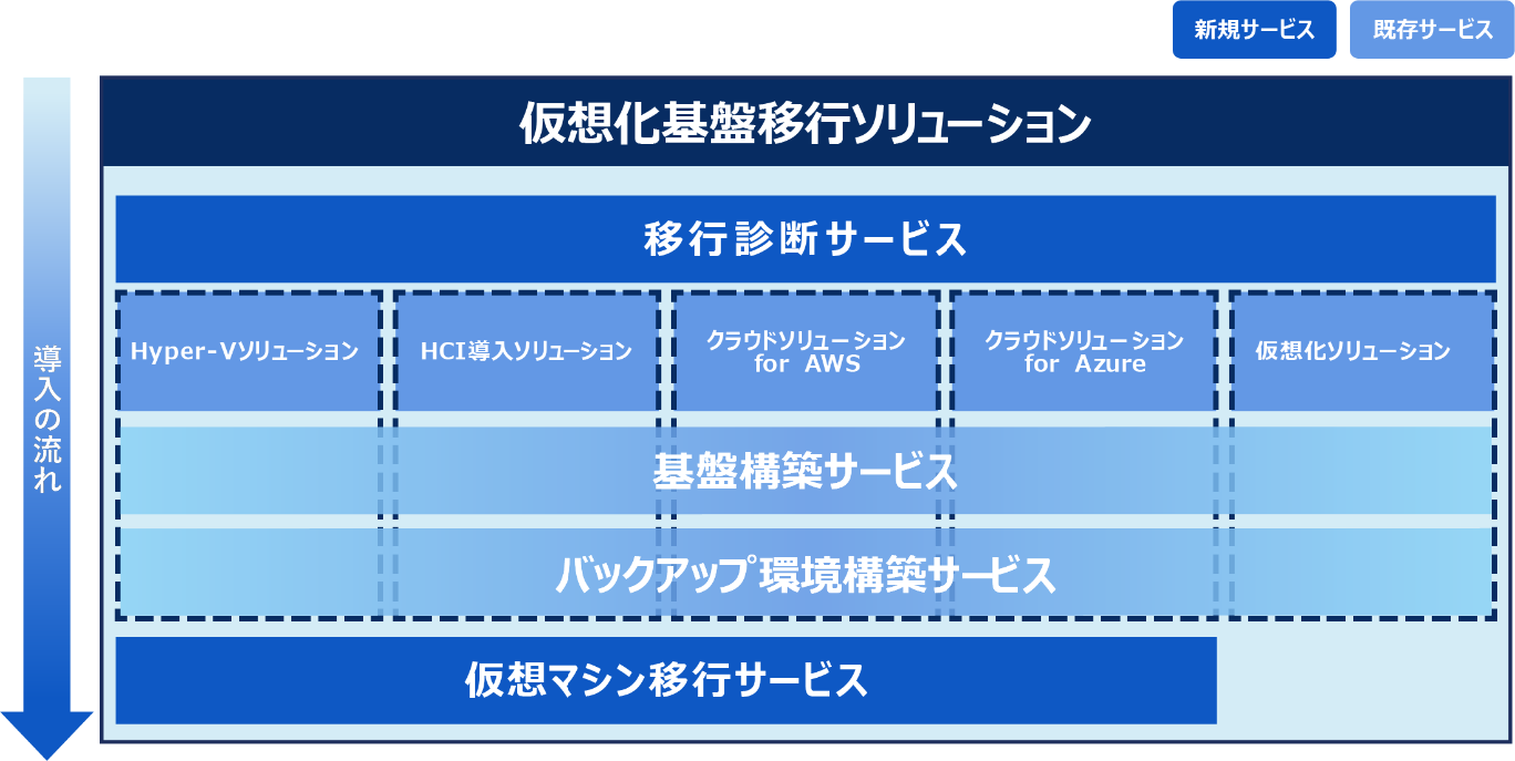 このたび、こうした実績をベースに既存の仮想化基盤構築ソリューションに新たなサービスとして「移行診断サービス」ならびに「仮想マシン移行サービス」を追加して、「仮想化基盤移行ソリューション」として提供を開始します。